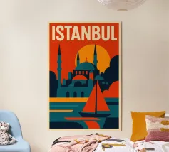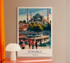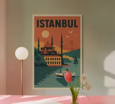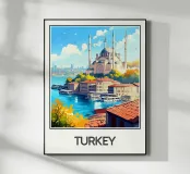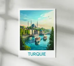 Immergetevi nell'incantevole atmosfera della Turchia con questo superbo poster illustrato. Una magnifica veduta del Bosforo con un'imponente moschea dagli slanciati minareti, barche che navigano sull'acqua e un paesaggio urbano immerso nella luce. Una decorazione da parete perfetta per gli amanti dell'architettura orientale e dei viaggi.