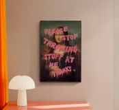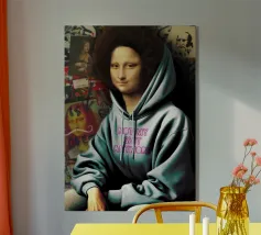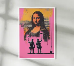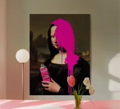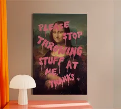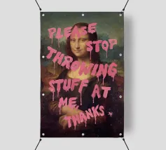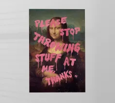Monna Lisa imbrattata con le parole "Per favore, smettetela di lanciarmi roba" in grassetto rosa.