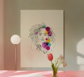 Un audace disegno al tratto di una giovane donna sicura di sé con voluminosi capelli ricci, resi con tratti profondi. Il suo sguardo è calmo ma potente e la sua bellezza naturale si irradia dal centro della composizione. Cerchi sovrapposti dai colori vivaci - rosa caldo, giallo solare, arancione intenso e lavanda - la circondano come un'aura, simboleggiando gioia, resilienza e identità. Il contrasto tra l'espressivo disegno a inchiostro e gli schizzi di colore in stile pop crea un senso di equilibrio dinamico e di moderna eleganza.