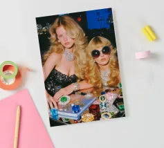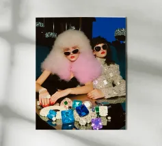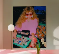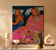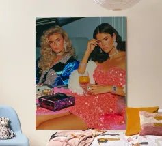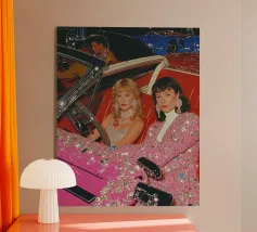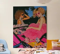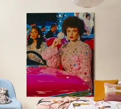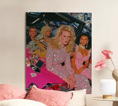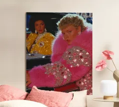 arte glam anni '80, stampa moda retrò, abito in pelliccia scintillante, donna glam con diamanti, arte vintage di lusso, stile donna pericolosa, atmosfera nostalgica anni '80, opera d'arte porsche girl, divertente illustrazione in pelliccia, arredamento retro diva, stampa moda audace, arte femminile appariscente, arte murale glam di lusso, poster estetico anni '80, opera d'arte dell'era disco, stampa donna di potere, stile iconico anni '80, illustrazione glam al neon, moda auto d'epoca, alta moda retrò
