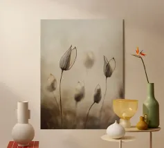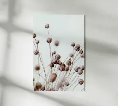 Strutture sottili, fiori delicati e fragili fili d'erba attraversano il quadro come vene in filigrana, creando una scena rasserenante e al tempo stesso profondamente commovente. I toni dominanti del beige conferiscono all'opera un'eleganza sobria e invitano lo spettatore a scoprire la bellezza della semplicità. Questa composizione minimalista sussurra dolcemente la transitorietà della natura e la sottile ma potente bellezza che si nasconde in ogni momento della vita.
