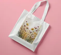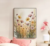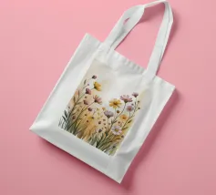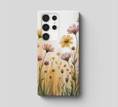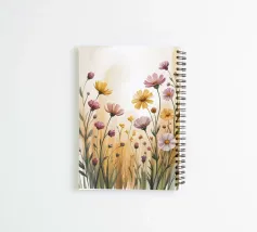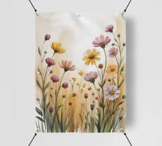 Un campo di fiori selvatici immerso in una luce dorata. Questo acquerello dipinto a mano cattura la semplice bellezza della natura con tratti morbidi e toni caldi, ideale per portare calma e freschezza in qualsiasi stanza.