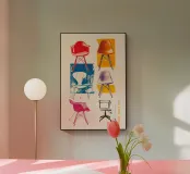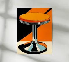 Stampa d'arte moderna e colorata con un collage di sedie iconiche in vibranti tonalità di rosso, arancio, blu, viola e rosa. Ogni sedia è posizionata in modo unico su blocchi di colore astratti e contrastanti, creando una composizione dinamica e giocosa. La scritta "Please, have a seat" (prego, accomodati) è sapientemente incorporata, aggiungendo un tocco invitante a questo pezzo moderno. Ideale per gli appassionati di interior design e per gli amanti dei mobili moderni della metà del secolo scorso.