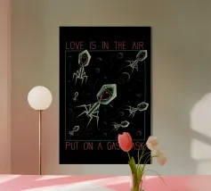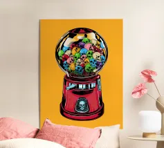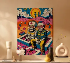 Questa arte murale audace e caotica presenta una sorprendente fusione di riflessi giallo neon, teschi disegnati a mano e un televisore vintage statico che crea un'intensa atmosfera distopica.
