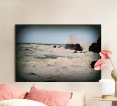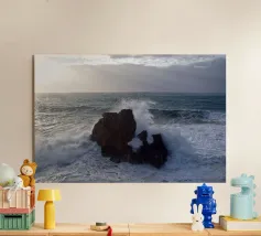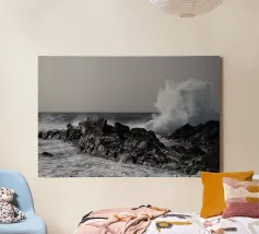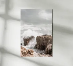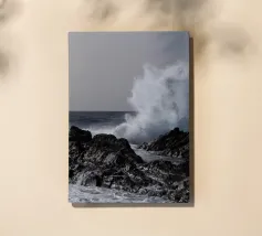 Testimoniate la potenza cruda dell'oceano che si scatena. Questa fotografia drammatica cattura il momento esplosivo in cui un'onda massiccia si scontra con un'antica costa vulcanica. Un caotico pennacchio di spruzzi bianchi erutta contro le rocce scure e frastagliate, mostrando l'indomita forza elementare della natura in tutta la sua gloria. Un'immagine potente e impressionante, un tributo allo spirito selvaggio del mare. Questo pezzo accattivante porterà una dose di energia naturale e cruda in ogni stanza.