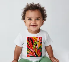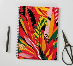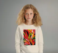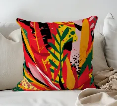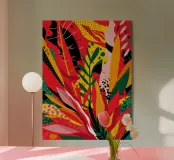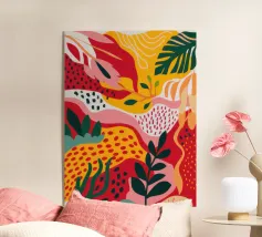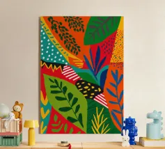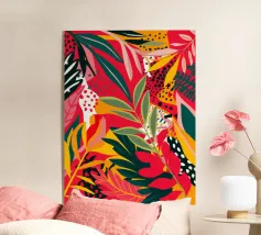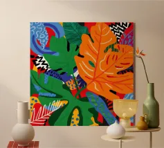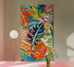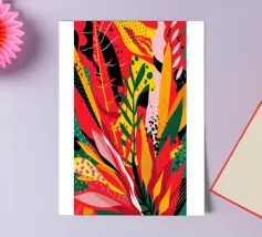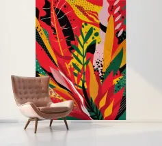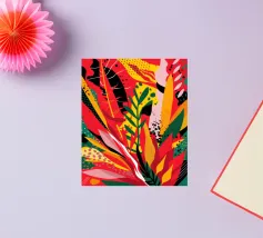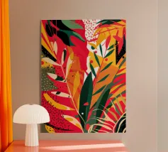 Un'ardente ed energica composizione astratta di foglie e forme tropicali in una tavolozza primordiale di rosso, arancione e giallo, con audaci linee nere.