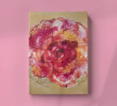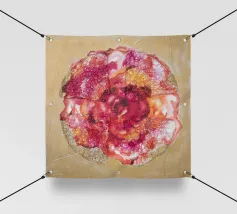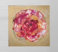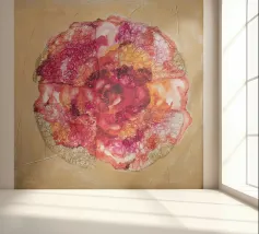 Una tela realizzata con diverse tecniche artistiche, combinando materiali diversi.