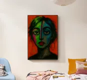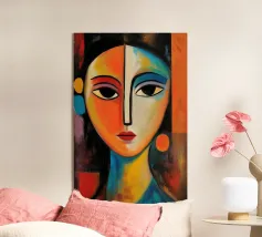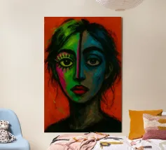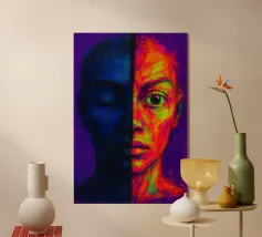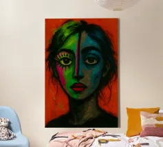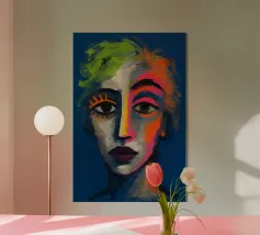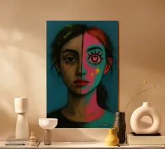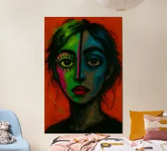 Vibranti arancioni, gialli e azzurri si fondono in piani fratturati su un volto in bilico, come se la luce stessa scolpisse nuovamente i lineamenti. Ogni pennellata pulsa di vita elettrica, bilanciando un'anatomia precisa con un'astrazione cromatica tumultuosa. Il ritratto emana fiducia e curiosità, sfidando gli spettatori a percepire la bellezza al di là di palette prevedibili. Stampato in qualità d'archivio su carta opaca spessa, è un audace punto focale per studi creativi, corridoi o salotti contemporanei, che ricorda a tutti coloro che lo vedono che l'arte può rifrangere la realtà in nuovi spettri abbaglianti.