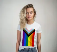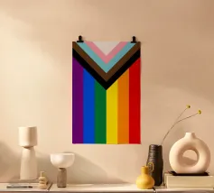 Rappresentazione suggestiva e simbolica della bandiera del Progress Pride, questo disegno fonde il tradizionale arcobaleno con l'aggiunta di strisce che rappresentano le comunità trans, nere e brune.