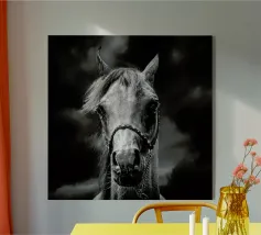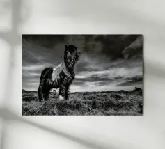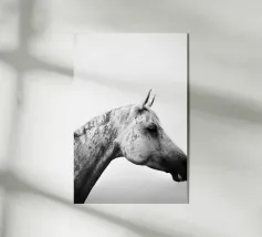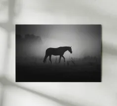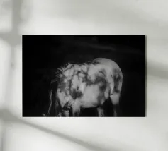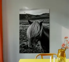 Puledro in piedi in un campo erboso in scala di grigi plexiglass
