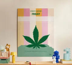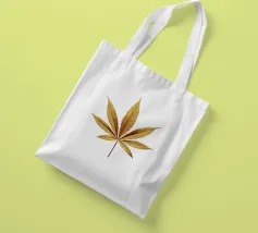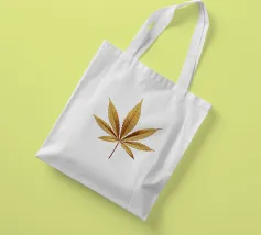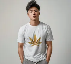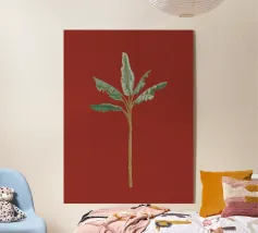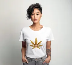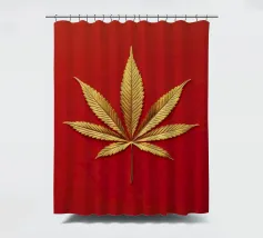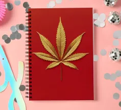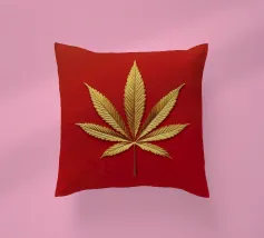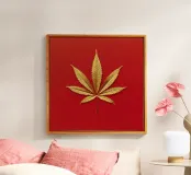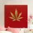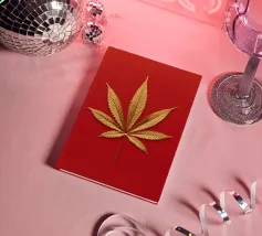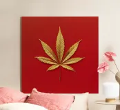 Una foglia di cannabis dorata e intricata con dettagli metallici è centrata su un audace sfondo rosso, creando un contrasto sorprendente e un'estetica lussuosa e moderna.