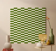 Quadri e linee viola e verde smeraldo su uno sfondo bianco brillante conferiscono a questo disegno un tocco festoso e giocoso. Ideale per aggiungere energia gioiosa e un tocco di moderno eclettismo al vostro arredamento.