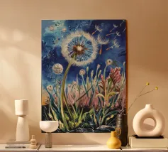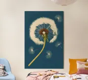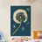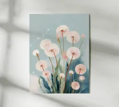 L'immagine mostra un dente di leone delicatamente disegnato su uno sfondo blu chiaro. Alcuni dei piccoli semi del paracadute stanno già fluttuando nell'aria, conferendo all'immagine una dinamica leggera e ariosa. Lo stile è scientifico e poetico al tempo stesso, quasi da manuale di botanica, ma con un tocco artistico. L'attenzione ai dettagli dei peli sottili e le linee chiare sottolineano il carattere preciso e illustrativo.
