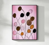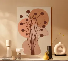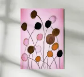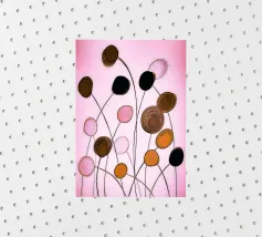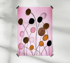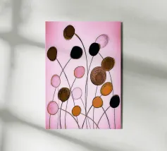 Una composizione floreale astratta con forme ovali fluttuanti nei toni del nero, oro, ocra e rosa. Linee sottili e sinuose collegano le forme come delicati steli su uno sfondo rosa tenue. L'immagine appare ritmica, organica e leggermente malinconica, allo stesso tempo tranquilla e vivace.
