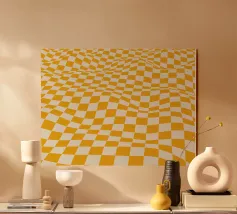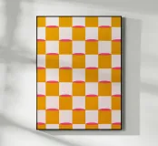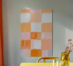Questo vivace quadro astratto combina un motivo a scacchiera in giallo senape, rosa e bianco con forme geometriche per creare un'atmosfera creativa e moderna. I colori vivaci e gli elementi minimalisti rendono quest'opera d'arte di grande effetto in qualsiasi stanza.
