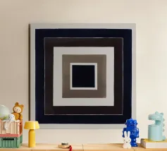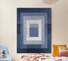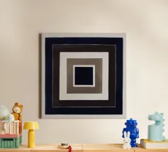 Un'astrazione geometrica di quadrati annidati che mescolano l'indaco profondo, il marrone terroso e il taupe tenue. Le fasce alternate creano una progressione ritmica verso l'interno, evocando equilibrio, simmetria e un sottile senso di profondità. Questo pezzo fonde la precisione modernista con una tavolozza naturale, ideale per interni contemporanei dall'estetica raffinata.