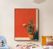 Una serena opera d'arte botanica che raffigura un delicato fiore proteso verso la luce, su uno sfondo corallo vivace. Questo pezzo cattura un momento di tranquilla crescita e delicato ottimismo, fondendo texture morbide con una tavolozza di colori audaci. Ideale per interni moderni, dona calore, calma e un sottile senso di gioia a qualsiasi spazio.