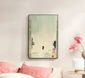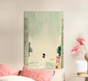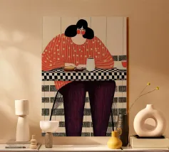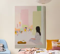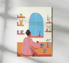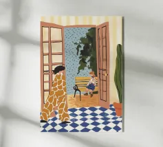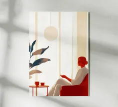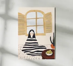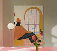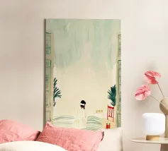 Questa illustrazione astratta minimalista cattura un momento di quiete serale e di tranquilla riflessione. Una figura solitaria siede sul letto, incorniciata da persiane aperte ed elementi interni morbidi, mentre una luce delicata riempie lo spazio. I verdi tenui, i neutri caldi e le linee delicate creano un senso di calma, equilibrio e introspezione. La composizione spaziosa e le texture sottili enfatizzano il silenzio e lo spazio personale, rendendo quest'opera d'arte ideale per interni contemporanei, arredamento di camere da letto, illustrazioni editoriali o stampe d'arte che celebrano la solitudine e la vita lenta.