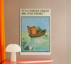 Quest'opera d'arte combina un'illustrazione figurativa minimale con una texture pittorica morbida per esplorare la calma intelligenza e l'introspezione. La forma semplificata e la composizione centrata enfatizzano l'immobilità, mentre la tavolozza di colori sobri crea un delicato ritmo visivo. Il soggetto antropomorfo introduce una sottile tensione narrativa senza simbolismi evidenti, consentendo all'atto della lettura di funzionare come una metafora visiva piuttosto che come una storia. Lo spazio negativo svolge un ruolo fondamentale, incorniciando la figura e rafforzando un senso di quieta concentrazione, equilibrio e presenza contemplativa.