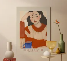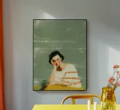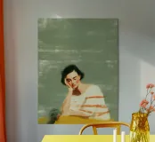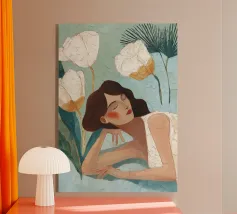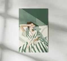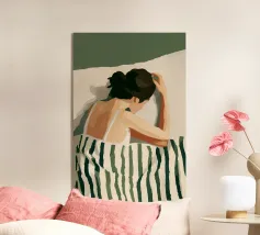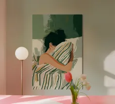 Questo ritratto contemporaneo cattura un momento di introspezione e di quiete emotiva. Una figura dai tratti morbidi appoggia la testa sulla mano, emergendo da pennellate stratificate su uno sfondo verde salvia. I toni caldi della pelle e i sottili accenti di ocra e terracotta contrastano delicatamente con l'ambiente freddo, creando equilibrio e profondità. La texture espressiva e pittorica enfatizza lo stato d'animo piuttosto che i dettagli, invitando lo spettatore in uno spazio calmo e contemplativo. L'opera d'arte esplora la solitudine, la tenerezza e la quiete interiore, rendendola adatta a interni moderni, ad ambienti di riflessione o ad ambienti curati.