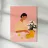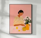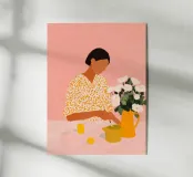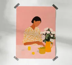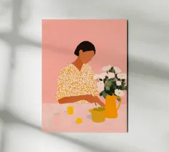 Un'illustrazione calda ed espressiva che cattura un tranquillo momento creativo. Una donna con una camicetta a fantasia dipinge delicatamente a un tavolo, circondata da morbidi toni rosa, freschi fiori bianchi e accenti gialli illuminati dal sole. La scena trasmette intimità e calma, celebrando la creatività quotidiana.