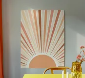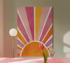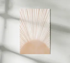 Linee radiose in morbide tonalità della terra irrompono da un semicerchio posizionato centralmente nella parte inferiore, creando un effetto a raggiera. Il design utilizza le calde tonalità del pesca, del crema e del marrone, aggiungendo un'estetica retrò.