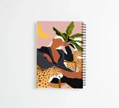 Ragazza Boss ghepardo leopardo animali selvatici tropicale arrossire donna signora vestito formale moda natura luna foglie di banano audace gatto selvatico