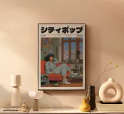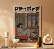 Questo splendido poster digitale, con una risoluzione di 7000x5000 pixel a 300 dpi, cattura un momento sereno e nostalgico. L'opera d'arte raffigura una giovane donna che si rilassa su un divano in una stanza accogliente e disordinata, piena di tecnologia e poster vintage. L'ampia finestra rivela un luminoso paesaggio urbano sotto un cielo azzurro, creando un pacifico contrasto tra interno ed esterno. Lo stile artistico ricorda gli anime degli anni '80 e '90 e l'estetica lo-fi, rendendolo perfetto per i fan dell'arte giapponese e della nostalgia retrò.