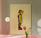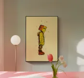 Un personaggio giocoso con la testa di cartone, che combina colori vivaci e linee decise. Quest'opera d'arte mescola umorismo e curiosità, invitando lo spettatore a interpretare la propria storia dietro la figura.