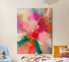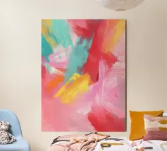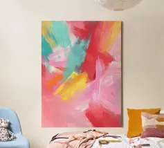 Questa opera d'arte astratta utilizza colori vivaci come il rosa, il giallo, il blu e il rosso in pennellate sciolte e giocose. Le forme sembrano libere ed energiche, creando un look divertente e creativo. Un disegno allegro che stimola l'immaginazione e aggiunge colore e gioia alle stanze dei bambini e agli spazi ludici.