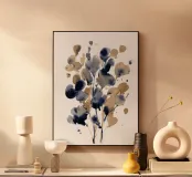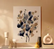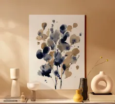 Un suggestivo studio ad acquerello di foglie e steli raggruppati in un profondo indaco e in un caldo ocra. Lavaggi sciolti e morbide schiarite catturano il ritmo organico della natura, bilanciando un contrasto deciso con una trasparenza fluida. Un'opera d'arte botanica moderna, minimale ed espressiva al tempo stesso.
