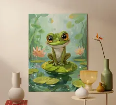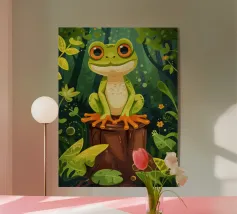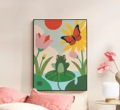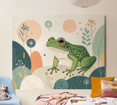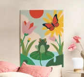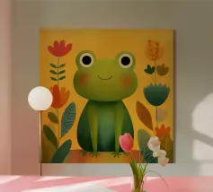 Questa illustrazione mostra gli splendidi dettagli di una serena rana verde in mezzo a un giardino fiorito punteggiato di farfalle colorate.
