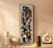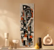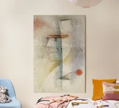 A textured abstract portrait constructed from overlapping geometric forms and weathered surfaces. The face emerges gradually through layers of blocks, curves, and negative space, creating a sense of quiet introspection and structural tension. Muted greys and off-whites dominate the composition, punctuated by restrained accent tones that add warmth and rhythm without overpowering the piece.