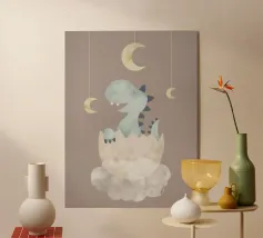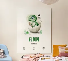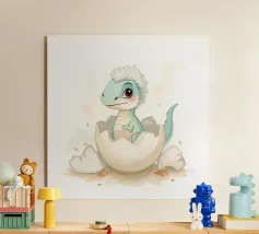 A cheerful green dinosaur hatches from an egg, surrounded by colorful butterflies and lush grass. The word "RAWR!" is spelled out in stone-like letters above the dinosaur, adding a playful vibe to the scene.