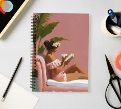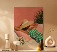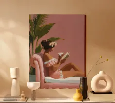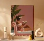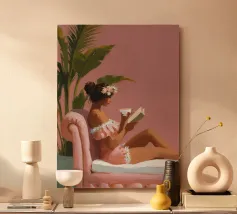 Rilassato, elegante e tranquillamente lussuoso. Una donna si gode un momento di calma con il suo libro in un interno rosa tenue accentuato dal verde tropicale. Ideale per un arredamento sereno ed elegante con un tocco di evasione.
