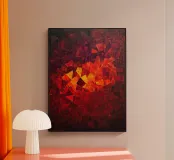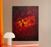 Un dipinto digitale astratto e dinamico, caratterizzato da forme geometriche dai contorni netti e dalle vivaci sfumature rosse, arancioni e gialle, su uno sfondo nero e bordeaux intenso. Il disegno evoca calore, energia e contrasto attraverso il colore intenso e la frammentazione angolare.