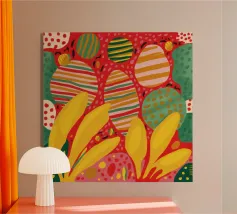 A vibrant and eclectic pattern featuring stylized red creatures, possibly foxes or cats, interspersed with colorful vases and plants. The composition is a playful and imaginative tapestry of recurring motifs.