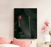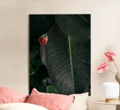 Una vivace coccinella rossa con macchie nere si posa su una foglia verde scuro, evidenziando il contrasto tra l'insetto e l'ambiente circostante. I dettagli e le texture della foglia sono visibili, aggiungendo profondità alla scena naturale.