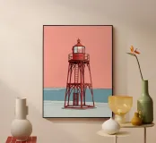 Illustration eines gusseisernen Leuchtturms in Rot. Diese Arte der Leuchttürme findet man in den Niederlanden.