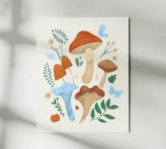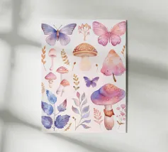 Illustrazione carina di funghi rossi, farfalle, fiori e piante botaniche con nome