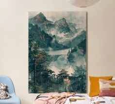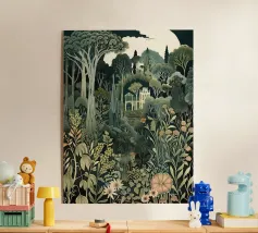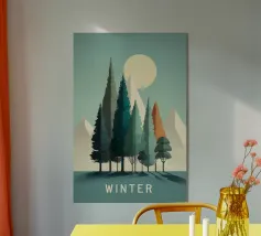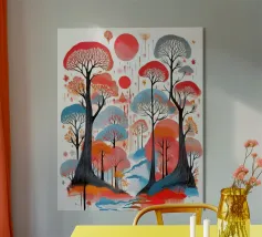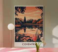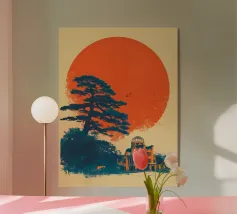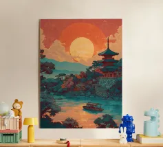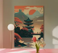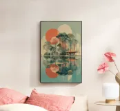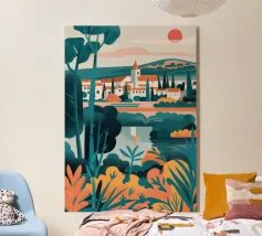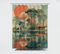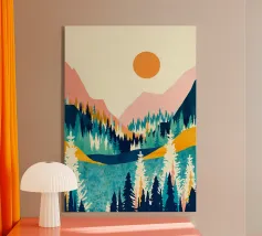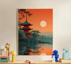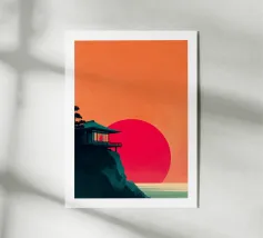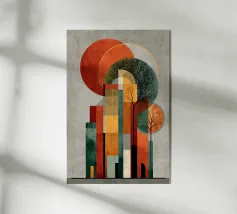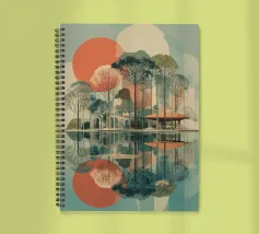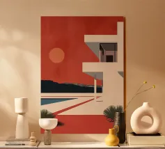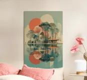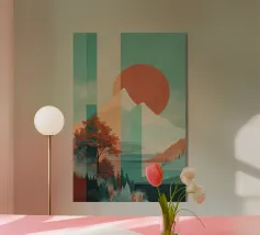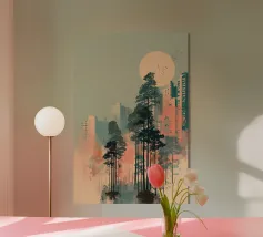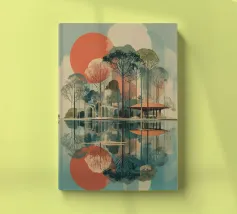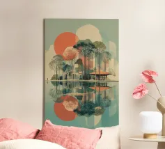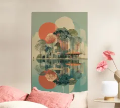 Un poster di viaggio sereno e geometrico con architetture astratte e alti alberi che si riflettono nell'acqua ferma. Ispirata al design modernista, questa composizione mescola pastelli morbidi e forme decise per un'atmosfera meditativa e onirica. Perfetto per gli amanti dell'estetica minimalista e delle scene di natura tranquilla.