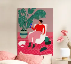 The painting shows a person in a pink outfit, lounging in a chair with legs propped up, holding a phone. The background includes a shelf with plants and books, evoking a sense of relaxed creativity.