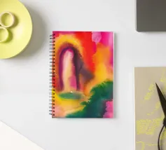 Paesaggio astratto ad acquerello dalle vivaci tonalità di rosso, rosa, verde e giallo.