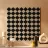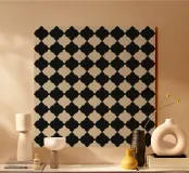 A repeating geometric pattern features black symmetrical shapes set against a light background, creating a visually striking contrast. The design forms a grid-like arrangement with a sense of harmony and order.