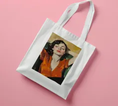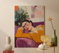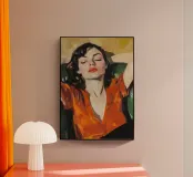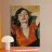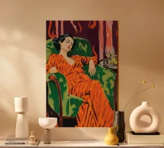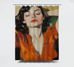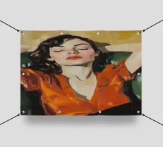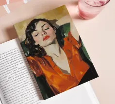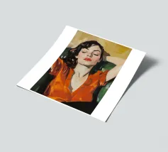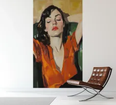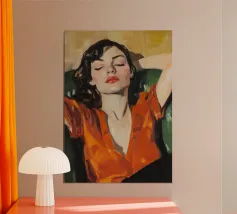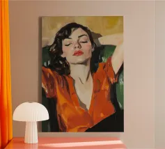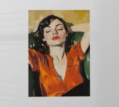 Dipinto a olio di una donna in top arancione seduta su un divano verde, con gli occhi chiusi e le braccia distese dietro la testa, stile anni '50, con capelli scuri e frange, pennellate visibili, affascinanti raffigurazioni di personaggi, luci soffuse e un bagliore dorato, con un'estetica retrò.