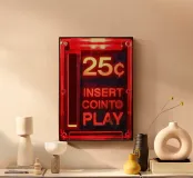 Questo poster riporta alla vera sensazione retrò dell'era delle sale giochi: "25¢ Insert Coin to Play" - l'iconica scritta illuminata delle sale giochi. Con il suo colore rosso brillante e il suo fascino nostalgico, ricorda i giochi di pixel, le slot machine e l'inizio di un turno di gioco. Perfetta per i giocatori, gli appassionati di retrò o come elemento di spicco in una sala giochi, in un bar o in un salotto. Un must per chi ama le atmosfere arcade.