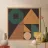 Un'opera d'arte astratta con forme geometriche nei toni dell'arancio, del verde e del beige, incorniciata da un bordo morbido su uno sfondo scuro.