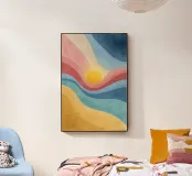 Un vibrante paesaggio astratto ispirato a palette di colori retrò e a moderne texture a guazzo. Fasce fluide di gialli caldi, rossi corallo, blu freddi e blu profondo circondano un sole incandescente, creando un effetto visivo dinamico ed edificante. La finitura pittorica e strutturata aggiunge profondità e carattere, rendendo quest'opera d'arte perfetta per decorazioni murali, poster, stampe, articoli di cancelleria e design d'interni contemporaneo. L'armoniosa miscela di colori evoca calore, movimento e un'estetica nostalgica e moderna.
