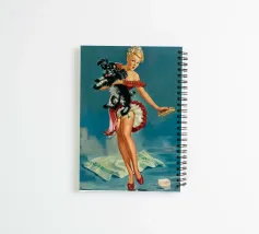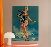 Una donna bionda in abito rosso tiene in braccio un soffice cane bianco e nero mentre si trova vicino a una saponetta e a una spazzola per le pulizie. La scena trasmette un'atmosfera retrò con un'atmosfera giocosa e vivace.