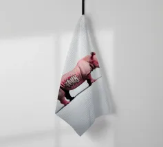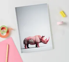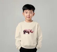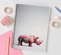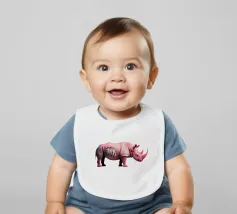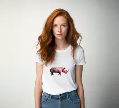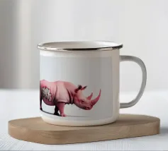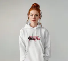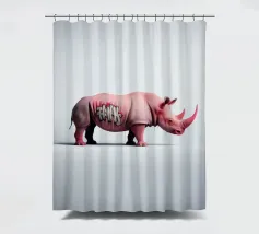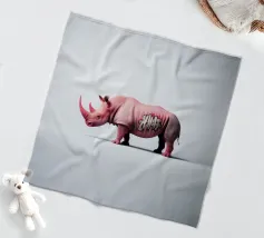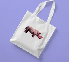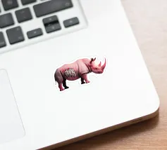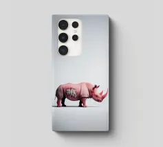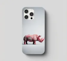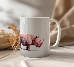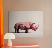 Un surreale rinoceronte rosa si staglia su un semplice sfondo bianco, con audaci graffiti sul corpo. Il design unico e moderno fonde l'estetica della street art con i temi della fauna selvatica, creando un concetto visivamente sorprendente e fantasioso.